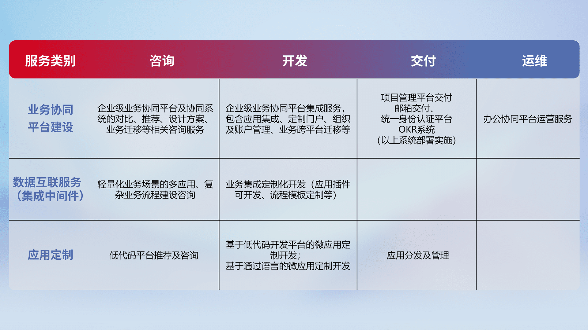 针对钉钉、、企微、、IDaas等平台级产品提供产品的规划、、方案、、交付、、、、定制化开发等服务,,实现如统一协同办公、、、、智能客户服务、、混合会议管理、、智能数据查询、、、、等业务场景,,实现数字化转型。。。。