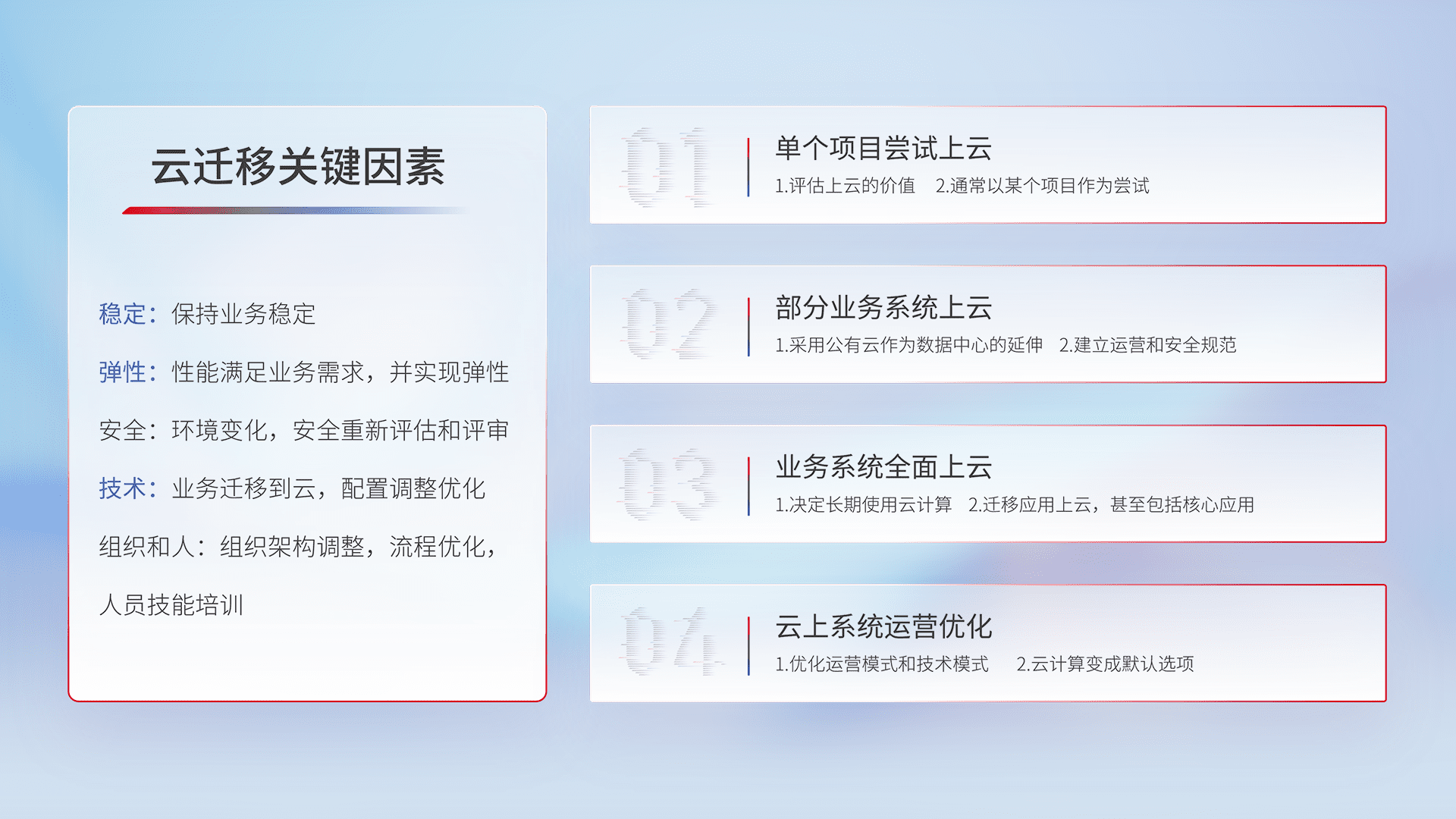 结合实际业务,,,,从规划设计、、、、云平台选型、、云原生改造、、、数据迁移、、集成交付,,迁移全过程为客户识别最佳上云路径,,,做好风险识别管理,,,设计网络架构、、身份权限、、、、安全审计合规、、操作审计、、、、日志审计、、监控告警策略、、、、多站点容灾设计等,,,对云上基础设施进行整体规划,,提升IT治理水平,,,,以满足弹性、、高可用、、高性能的需求。。。